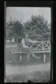 Porträtt av Axel Fredriksson, sittandes på en stol utomhus. "Axel foto 1928. "