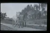 "Karl Fredriksson, Kvarntorp" En man står på vägen framför ett hus och håller två hästar.