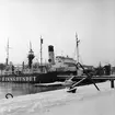 Isbrytaren Sankt Erik vid isbrytarpiren på Galärvarvet på Djurgården år 1987. I bakgrunden fyrskeppet tillika museifartyget Finngrundet.