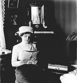 EN ÄLDRE KVINNA SITTER VID ETT BORD I FINRUMMET OCH LÄSER I EN BOK.