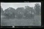 En man på en vagn dragen av två hästar. "Edvin Karlsson, Fogelstad. "