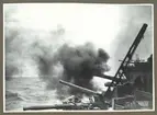 Jagaren NORDENSKJÖLD fotograferad från annat fartyg. Eldrör på kanon i förgrunden.