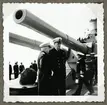 Kvinnor och flottister på däck under kanonerna, på ett pansarskepp. Andra bilder i Gunvald Bergers samling tyder på att denna bild tagits under flottuppvisningen i Göteborg 1929, men denna förmodan har inte kunnat bekräftas.