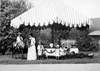 Kung Gustaf V, prins Gustaf (VI) Adolf, prinsessan Sibylla och prins Eugen och flera officerare sitter på podium och betraktar uppvisning(?).