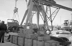 Nationalmuseum 1 31 maj 1966 Flera män hjälps åt att lasta av en stor trälåda från en bil som är parkerad utanför Länsmuseet. En man i kostym med ryggen åt kameran står beredd med en säckkärra att köra lådan på.