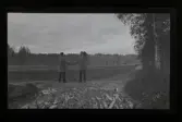 "Trädgårdsdrängar, Fogelstad" Två män tar i hand och hälsar på varandra i en lerig vägkorsning.
