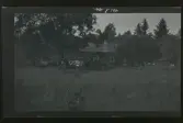 "Rosendal." Grupporträtt, kvinnor, män och barn uppställda på trappan till en byggnad. Längst fram sitter en man och en kvinna vid ett bord med blombuketter.