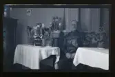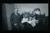 "Sadelmakare Andersson, Liden, Äs." En man står i ett rum vid ett bord med gratulations-blommor och presenter. På bordet står även ett inramat porträtt av en kvinna.