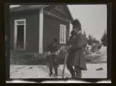 En man bereder ett skinn. Hans hund sitter och iakttar arbetet.