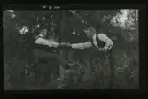 Teatern gamla studenter. Teatersalongen i Trelleborg blev från början icke enbart ett Thali-tempel, utan även vid en mängd jubileer och andra festligheter togs den rymliga och vackra lokalen i bruk. Här ses vid ett förstamajfirande år 1906 på de tiljor, som skola föreställa världen från vänster och övre raden kammarskrivare Fredrik Boström, häradsskrivare L. Callmer, Ivar Sjöblom, kammarskrivare G. Mörck, kammarskrivare Agne Bokander, postexpeditör Lasse Carlsson, dir. Nils O. Hörle, postexpeditör P. V. Dahle, ett par okända, stud. Alfred Rickard, kammarskrivare Leissner, Torsten Forsse, Nils Sjöblom, kamrer Carl Nilsson, bankkamrer Svante Hillman, redaktör Lars Rydner, kamrer Mattiasson, tandläkare Nils Helmont, doktor Axel Hjort, stationsinspektor L. Geimer, postexpeditör Bagger-Jörgensen, auditör Axel Westman, rådman Ekstrand, advokat Wadén, veterinär Olof Rasmusson, trafikchef Sjöblom, godsägare Reventberg, häradshövding F. Malmros och dr Waldemar Björkholtz.