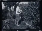 Porträtt av en ung man i en trädgård. Bakom honom skjul och jordkällare.