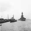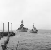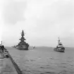 Foto taget med utsikt från pansarfartyg. I bakgrunden går två större tankfartyg. I förgrunden syns kanonpipan och del av fartygsdäcket.