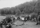 Kaffepaus vid potatisläggning på Arnstorp maj 1914. Beda Jonsson född Björn, Bäve 1892-12-20, Abraham Jonsson, Hj 1875-01-13, Britta Berntsdotter, Hjärtum 1843-07-12, och Olga Jonsson, född Olsson, Forsh 1891-05-12 sitter med kaffepanna, kaffekoppar och kaffekorg i gröngräset och i bakgrunden betar hästarna.