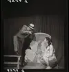 561 A Operareportage för tidningen Vi. Två dansare i clown-scenkostymer och talar med en man bakom kulisserna.