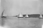 Från KSSS volontärkappsegling på Bogesundsbanan 20 augusti 1916. Närmast med segelnummer 8 plymsnäckan IVERNA. På avstånd längst t h med segelnummer 11 ses 16 kvm snäckan KAMRATEN. IVERNAs och KAMRATENs identitet framgår av andra fotografier från seglingen i KSSS årsbok 1917 s 172 f. Båten närmast efter IVERNA har inte kunnat identifieras.