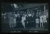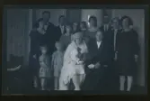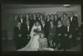 Bröllop. Brudpar, bruden i svart klänning och vit slöja. Två andra par, marskalkar och tärnor, stående på var sin sida om brudparet. Samtliga, män och kvinnor, har blommor fästade på vänster axel. Bodums socken, Ångermanland.