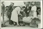 "Tomater och gurkor granskas". "Dagligt liv i Sverige 1930" Dagens Nyheter utlyste en fototävling den 15 juni 1930 för amatörfotografer. Temat var att "i logiskt sammanhängande fotografier ge glimtar av originella eller vardagliga former av svenska folkets liv, i helg och söcken." Förebild för tävlingsbidragen var den kända bildsidan "Fotografen berättar" i Dagens Nyheters söndagsbilaga. Antalet fotografier i varje serie skulle vara minst 10, högst 12. Som prisnämnd fungerade två av tidningens medarbetare samt docent John Herzberg på KTH, tillika känd fotograf. Läkaren och hängivne amatörfotografen E D Schött i Stockholm gick ut på Hötorget en vacker augustidag. Bilderna har möjligen tillhört och skänkts till museet av Helmer Bäckström.