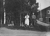 Familj med trädgårdsredskap framför hus, 1920-tal