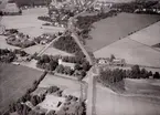 Rubrik: Lyxvillor 25 maj 1966. Landsvägen genom Lillån. Riksväg 50 norrut. Kåviskylt i bakgrunden. Det är högertrafik på bilden, så bilden är tagen efter 3 september 1967.