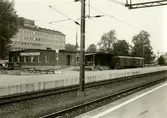 Klippan järnvägsstation med godsmagasin till höger och många tåg på bangården samtidigt.