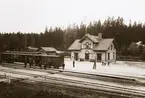 TVÅ MÄN LOSSAR OBRÄND KALK FRÅN EN JÄRNVÄGSVAGN TILL EN HÄSTSKJUTS. SE LYRESTADSBOKEN, SID 354.