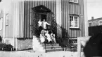 Foto av en skolklass med lärare, som samlats utanför skolans port.