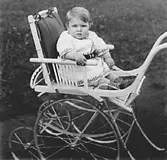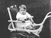 Babykläder, 6 april 1966 En baby ligger i en barnvagn och tittar. Den är iklädd sparkdräkt, jacka och mössa. Vid huvudänden lligger ett gosedjur. or. Han går nedför en kort trappa utomhus.