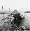 Isbrytaren Sankt Erik bogseras till dockan på Beckholmen under vintern 1987.