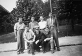 "Karantänsförläggning" på Kvarnbyskolan för flyktingar från koncentrationsläger i Tyskland 1945. Manliga flyktingar utomhus.