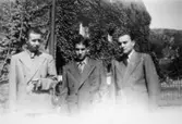 "Karantänsförläggning" på Kvarnbyskolan för flyktingar från koncentrationsläger i Tyskland 1945. Tre manliga flyktingar utomhus.