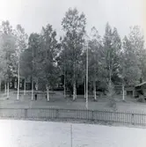 Midsommarfirande utanför Katrinebergs daghem, 1992-93. Fröknar och barn dekorerar inför firandet. I bakgrunden syns Åby bostadsområde.