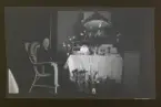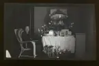 "Gustav Ekroth." Porträtt av en man som sitter vid ett bord fullt av gratulations-blommor.