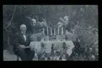 "Oskar Andersson, Mo gård." En man sitter utomhus vid ett bord överfullt av gratulations-blommor.