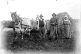 Hökörning Vasared 1945, ännu järnringshjul. Helge Vasling, Märta Sjöstedt, Kristina Vasling i skrindan bakom räfsa, Karl-Edvard Pettersson och Alma Pettersson.