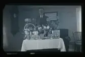 "Otto Larsson, snickare Björksta, Äsköping, f. 1882." Porträtt av en man som sitter vid ett bord fullt av gratulations-blommor.