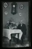 "Från Källtorp, Girnmersta." Porträtt av en man som sitter vid ett bord med gratulations-blommor.