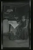 "Anna o Gustaf Karlsson, Hälltäppan." Porträtt av en familj som står vid ett bord fullt av gratulations-blommor.