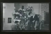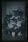 "Anna Johansson (Axels kusin), Abbotnäs." Porträtt av en kvinna som sitter vid ett bord med gratulations-blommor.