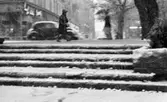 Vårregn, 31 januari 1966 Två damer klädda i mörka kappor, knytskor och handväskor hängamde på armarna samt med paraplyer i händerna är i färd med att gå över en gata i centrala Örebro. Det regnar och ligger även snö på marken. I bakgrunden på trottoaren kommer en man och en kvinna gående. En bil kör på gatan. Byggnader syns i bakgrunden längre bort.