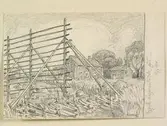"Typisk ångermanländsk gård". Hässja i förgrunden. Teckning av Ferdinand Boberg.