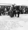"Konung Gustaf V och Drottning Victoria hälsas välkommen till Uddevalla av borgmästare Sixten Neiglick. Bakom drottningen landshövding Oscar von Sydow 7 juli 1918. Enda gången drottningen besökte Uddevalla och Bohuslän"