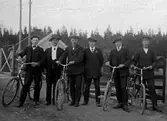 SJU MÄN OCH EN KVINNA DRICKER KAFFE I GRÄSET. EN MAN SPELAR FIOL.