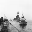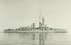 Pansarskeppet DROTTNING VICTORIA under gång. I förgrunden kanoner på pansarskeppet SVERIGE.
