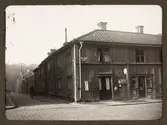 "Upsala. Öfre Slottsgatan", hörnet Åsgränd - Övre Slottsgatan, kvarteret Kornhuset, Uppsala 1928
