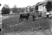 Gesäter, gården Holkan. Kossan “Runa” på bete har fått besökare