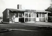 Vägstation G3, Vislanda. Stationsbyggnadens högra del med verkstad och kontor. Bensinpump (drivmedelspump) med personbil Saab, vid verkstaden liten lastbil (paketbil).