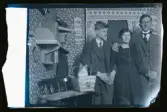 "Vi fyra vid Tegelbruket." En katt i en korg, Ivar och makarna Frida och Axel Fredriksson i ett rum med blommiga tapeter.
