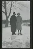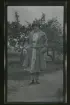 Porträtt av en kvinna ståendes utomhus, klädd i kappa och med ett paraply i ena handen. "Brita Holmstrand, mejerinna Fogelstad."