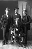 Fotografi från expedition till Spetsbergen. Motiv av en grupp män som dricker kaffe och röker pipa på en stenig strand.