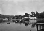 Enligt Bengt Lundins noteringar: "Lyckorna. Ångbåtsbryggan och kallbadhuset. Uddevalla vid bron".